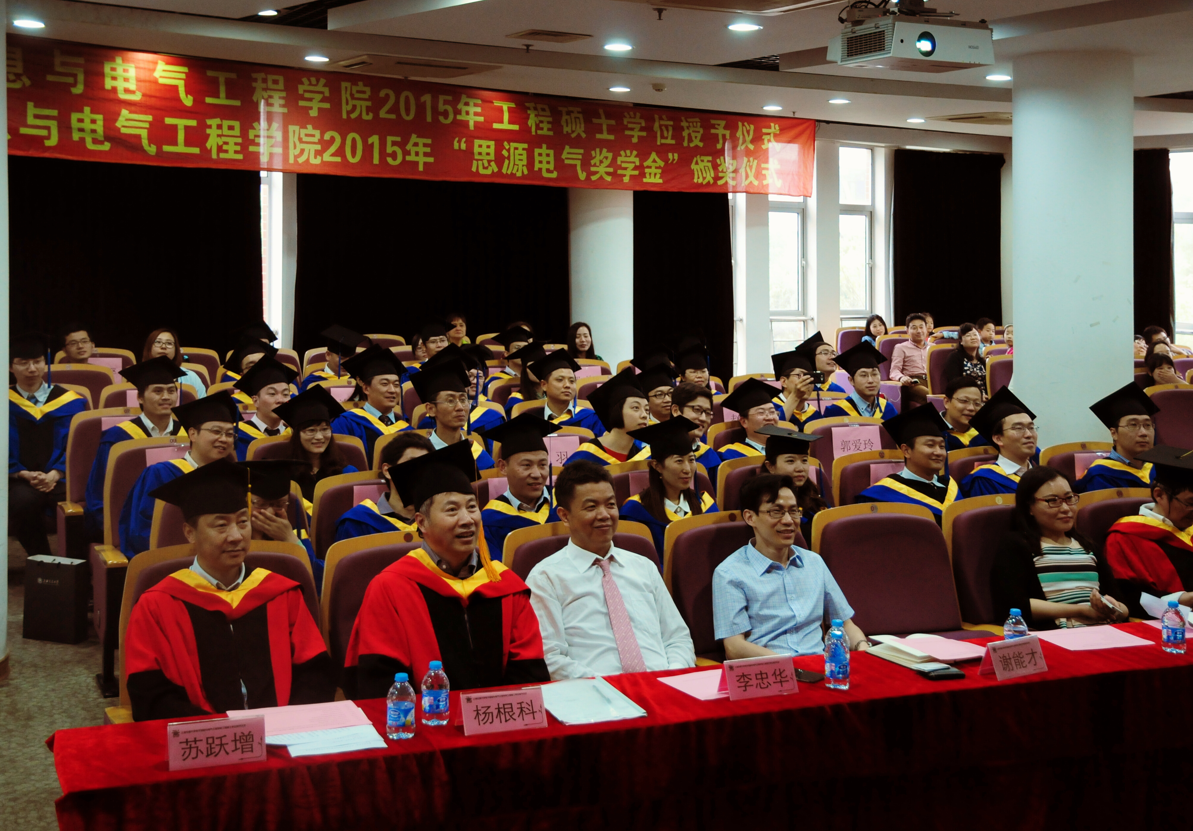 2015年5月23日,好色tv 2015年工程硕士学位授予仪式在电院楼群报告厅隆重举行。学位授予仪式由电院副院长邰能灵主持。研究生院副院长杨根科、电院党委书记苏跃增、党委副书杨一帆、电气系主任严正、先进电子材料与器件校级平台(AEMD)主任苏翼凯,导师代表张忠能,宝钢首席研究员兼特聘导师郭朝晖,思源电气股份有限公司总经理助理李忠华,昆山龙腾光电有限公司人力资源部经理谢能才等出席了典礼。