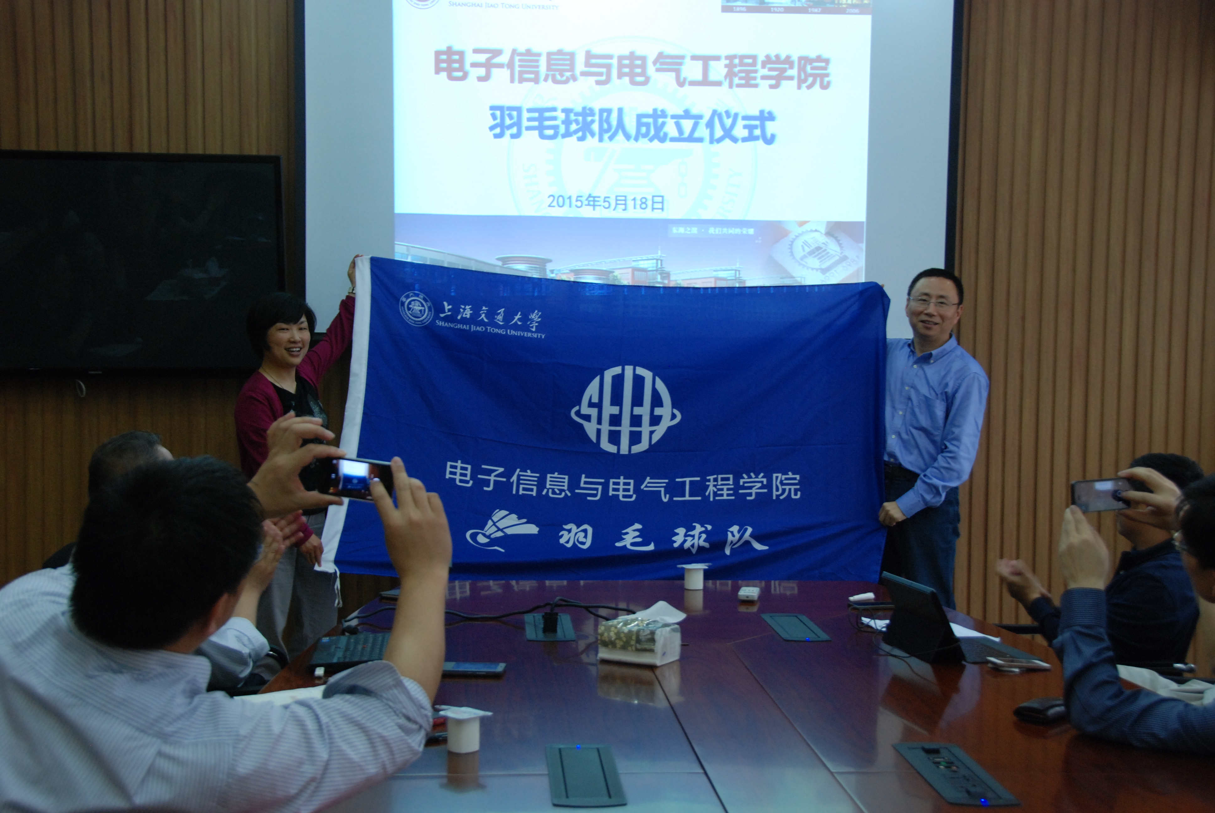 2015年5月18日中午,好色tv 羽毛球协会暨电院羽毛球队成立大会,在电院群楼3-308会议室举行。信息技术与电气工程研究院院长郁文贤、学院党委副书记杨一帆、软件学院党总支书记兼副院长胡飞、电工中心主任张峰等领导和老师参加了成立大会,成立仪式由杨一帆主持。