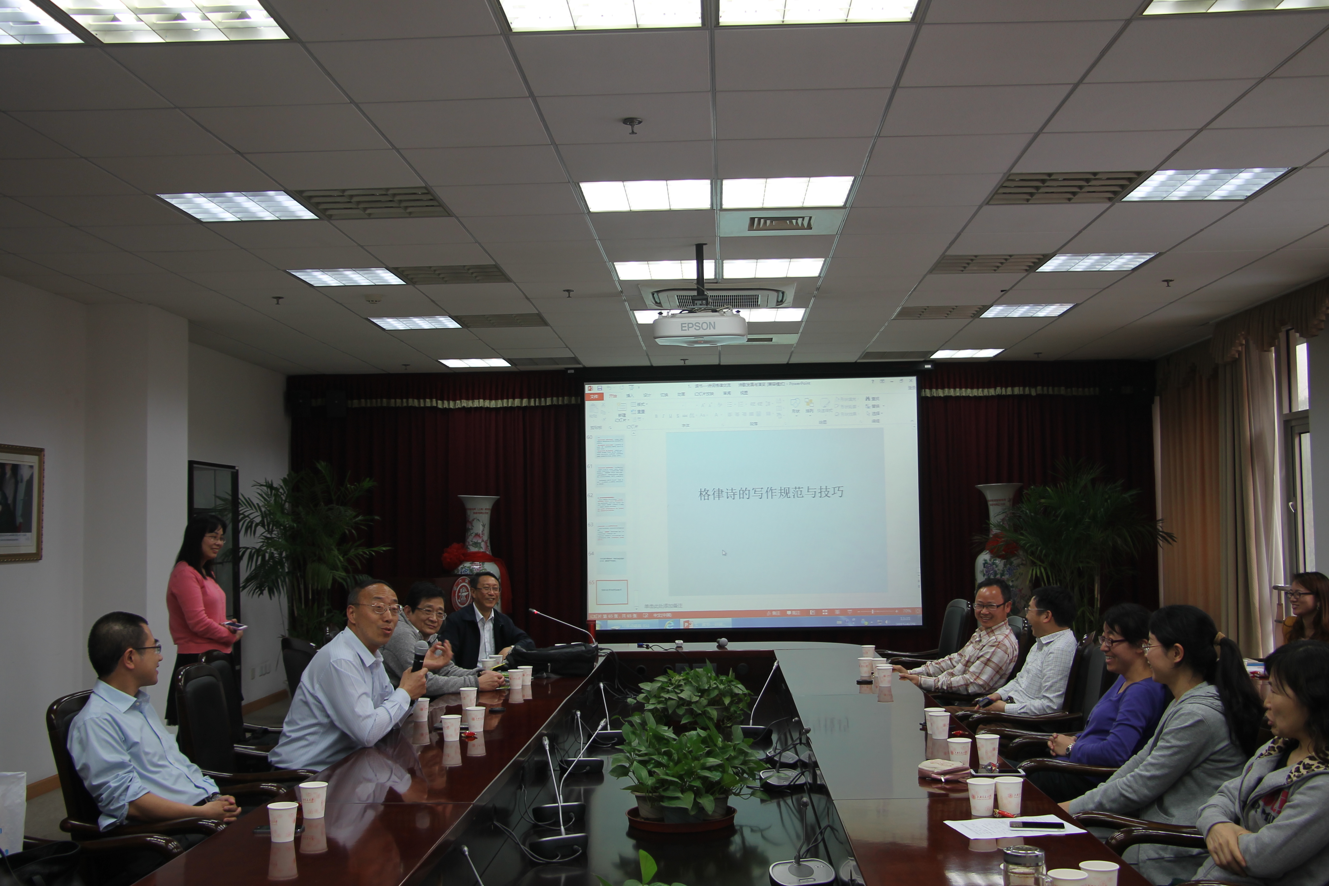 12点30,在“琵琶语”的悠扬乐曲中老师们陆续师进入会议室。会场正在播放的是胡卫生书记和归琳老师精心准备的“诗、书、画”赏析,名诗、名画和的书法作品结合在一起,再加上颜琳老师选取的配乐,为这一场春日里的读书活动营造了优雅的气氛。活动在书香俱乐部李燕老师主持下开始,罗汉文老师首先对中国诗歌的发展进行了详细的解说,并对各个历史时期的优秀代表作品进行了点评。在介绍了如何欣赏诗歌之后,罗老师也提及了如何写诗,并推荐了一些诗歌方面的书籍供大家参阅。在罗老师做报告的同时,方向忠和李力利、陶玉群等老师为大家现场沏泡了各种绿茶和红茶,并为大家准备了茶后小零食。现场观众一边赏诗,一边品茶,,兴趣浓厚,反应热烈,老师们就诗、茶等相关话题进行了提问和讨论。活动接近尾声时,莫光成书记做了讲话,称赞电子系本次活动很有创意,他说这样的沙龙活动,形式灵活,又有利于形成良好的文化氛围、提高教师的凝聚力,希望以此为开端,充分发挥各系的基层引领的作用,开展更多活动,丰富教职工生活。