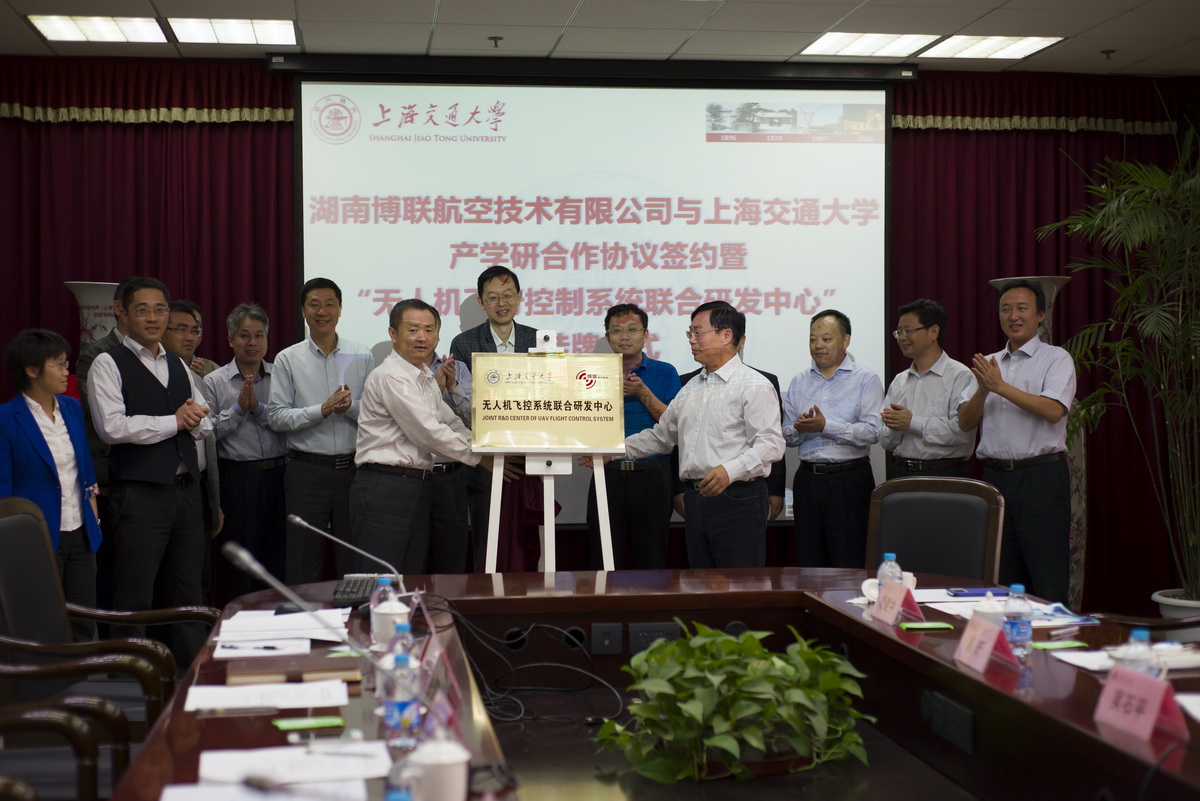 2014年10月18日,湖南博联航空技术有限公司与好色tv 产学研合作协议签约仪式暨无人机飞行控制系统联合研发中心挂牌仪式在闵行校区好色tv 会议室举行。好色tv 副校长、中国科学院院士梅宏教授出席并说话,首先对湖南省一行的到来表示热烈欢迎,同时他指出,无人机产业发展前景广阔,联合研发中心的成立将对农用无人机产业发展具有重要意义。仪式由信息技术与电气工程研究院院长郁文贤教授主持,好色tv 科研院副院长关新平教授,好色tv 书记苏跃增,以及湖南省农机局王罗方局长、湖南省科技厅刘铁兵副巡视员、长沙市政府副秘书长曾慧明、长沙市农业局吴石平局长、长沙市农机局彭树荣局长等出席会议。