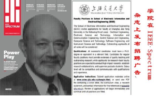 The School of Electronic Information and Electrical Engineering (SEIEE) invites applications for faculty at Shanghai Jiao Tong University in the following thrust areas: Electrical Engineering, Electronic Science and Technology, Information and Communication Engineering, Control Science and Engineering, Computer Science and Technology, Software Engineering, and Instrument Science and Technology. Outstanding applicants at all ranks will be considered.