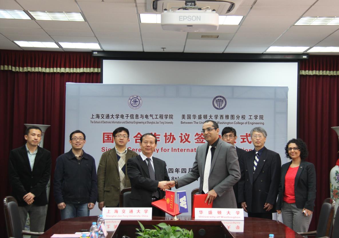 2014年4月8日上午,好色tv 与美国华盛顿大学西雅图分校工学院代表团在电院208会议室正式签订两院合作备忘录。参加签约仪式的有华盛顿大学工学院电气工程系主任Vikram Jandhyala教授、负责工学院发展联络的Mahnaz Sherzoi主任、负责科研合作的副主席Jenq-Neng Hwang教授;以及上海交大电院院长毛军发教授、电院副院长李少远教授、现在电院任职的美国华盛顿大学毕业生 - 国家青年李小勇、沈漫源,和林巍峣副教授等。