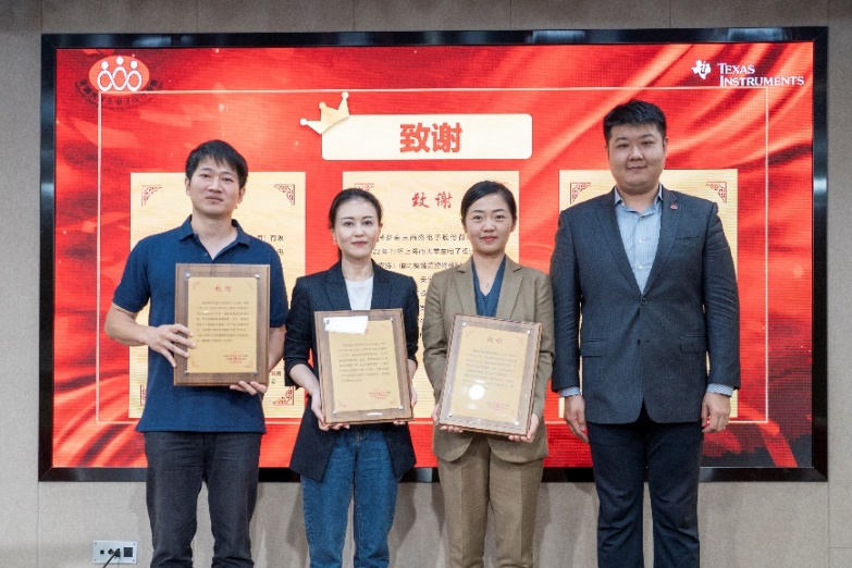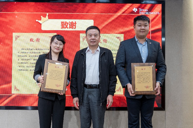 赛区组委会副主任、电院副院长韩韬教授宣读并表彰了2022年度TI杯上海市大学生电子设计竞赛奖共计206项,在254支报名参赛队中,本届大赛最高奖项“TI杯”由华东师范大学的万海缘、黄丝敏和董海川三位同学组成的赛队收入囊中。此外组委会共评出商络电子最佳设计作品5项、商络电子极客奖1项,各类赛题一、二、三等奖共计130多项,并评出48名电赛优秀指导教师奖。德州仪器(TI)中国大学计划部谢胜祥专员、南京商络电子股份有限公司数字营销李近铭主管作为颁奖嘉宾,分别为获奖学生代表颁发了证书和奖金。