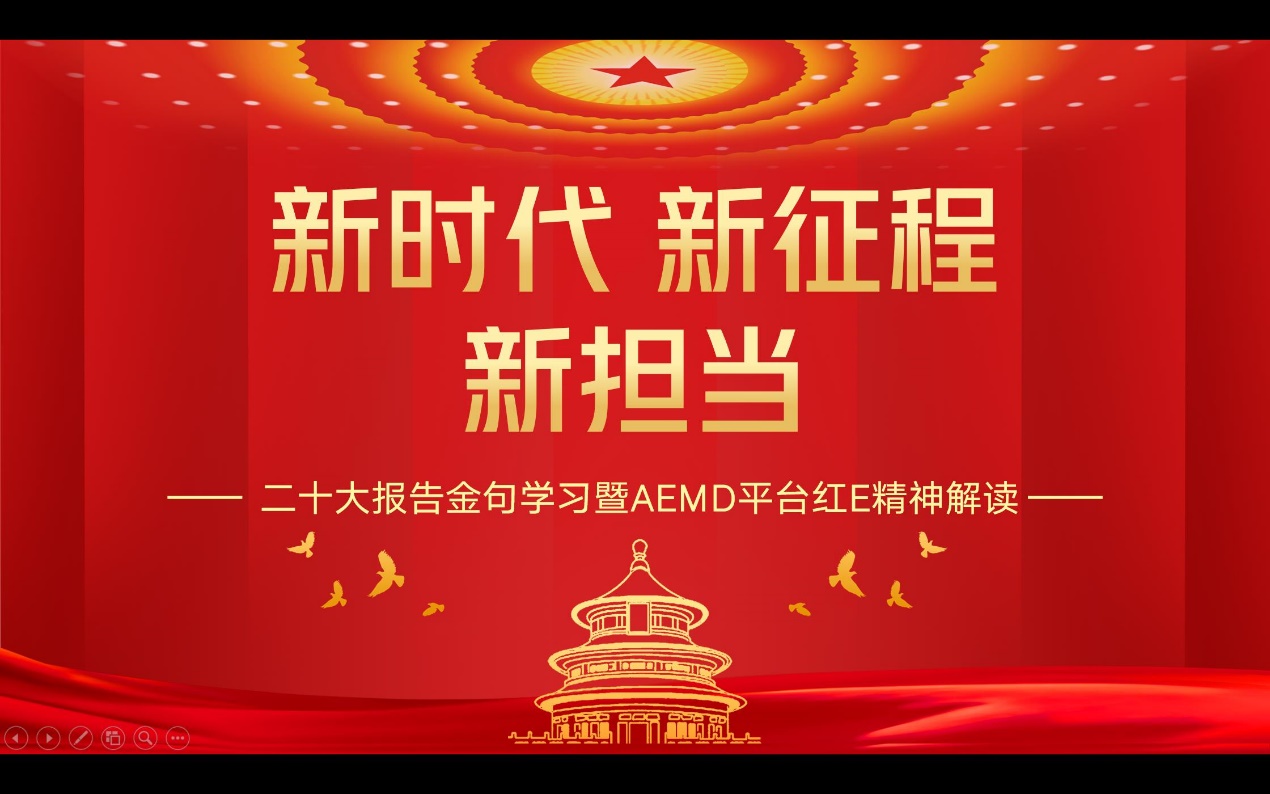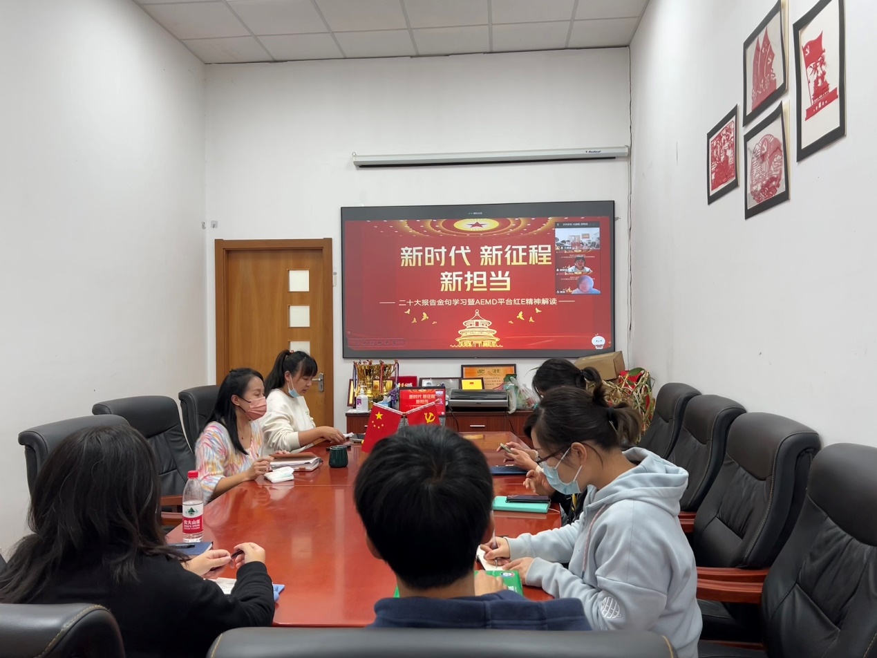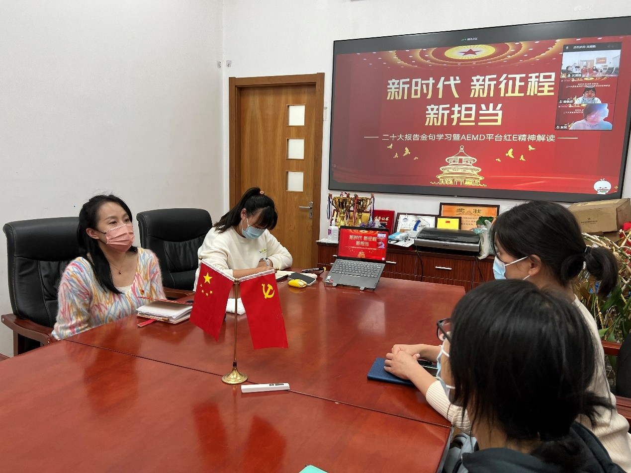 党的二十大报告体系严密、博大精深、论述精辟,系统而深刻地阐述了马克思主义基本原理同中国具体实际相结合、同中华优秀传统文化相结合的思想精髓,鲜明而全面地提出了习近平新时代中国特色社会主义思想的世界观和方法论,完整而精准地阐明了“中国式现代化”的五大特征、本质要求和重大原则。AEMD平台直属教工党支部用二十大报告“金句”学习的方式,以党的二十大精神为指引,共同学习探讨习近平新时代中国特色社会主义思想的思想之源、思想之基、思想之果,做到知其言更知其义、知其然更知其所以然。党支部书记刘毓闻表示,党的二十大精神的学习、贯彻、落实,绝不是一次学习、一次讨论就能完成的,要多次学习反复思考,要在常学常新中感悟思想伟力、指导行为实践。
