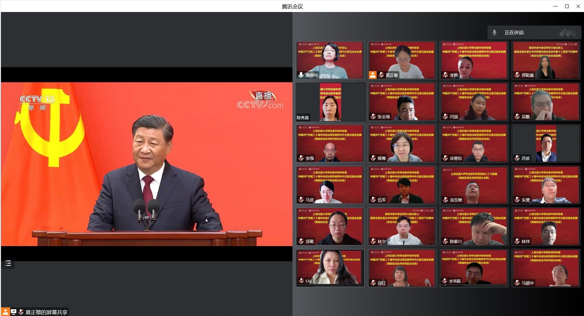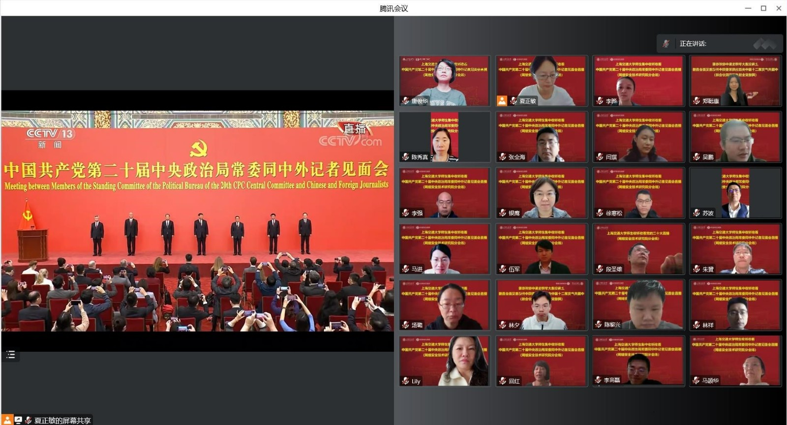 10月23日上午12时,党支部通过腾讯会议形式开展集体收看中国共产党第二十届中央政治局常委同中外记者见面会直播。
