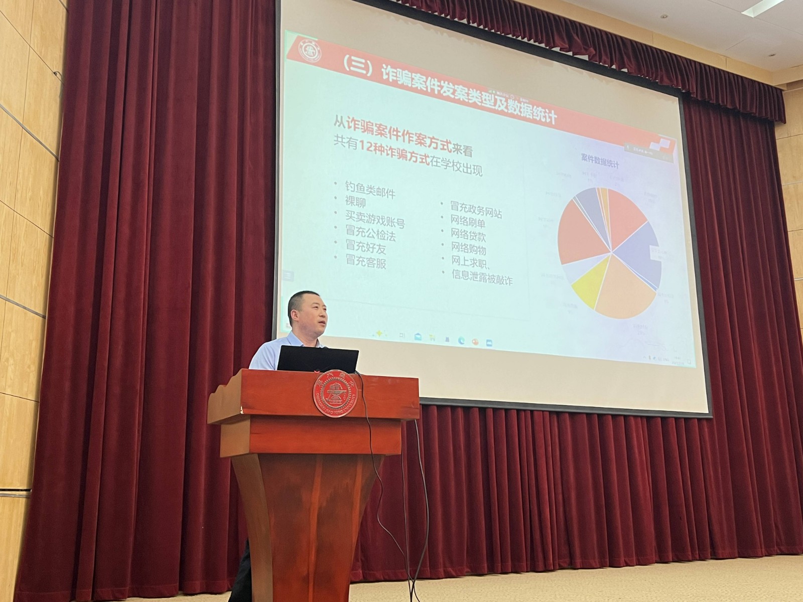 杨立志作“我的安全我做主,校园安全共分担”主题讲座,介绍了高校治安形势及保卫处业务,展示了2022年校园诈骗案总体情况,运用实例和经验告诫同学们提高反诈意识、共创平安校园。