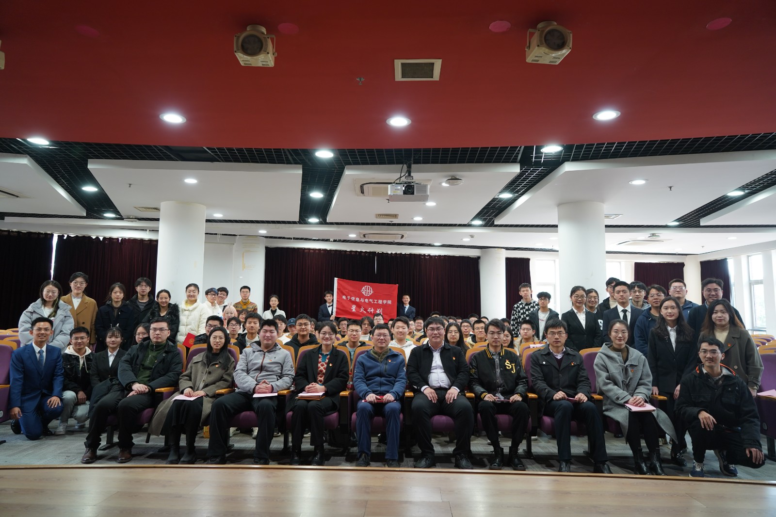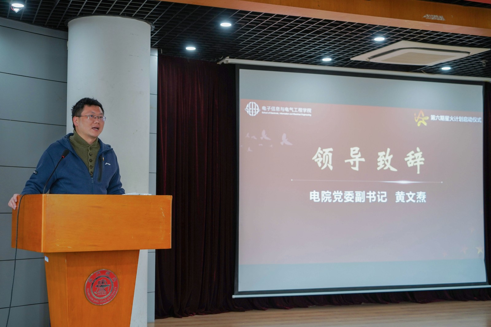 黄文焘为启动仪式致辞。他讲述了电院校友石煜参与研发中国高速磁悬浮交通系统的励志故事,勉励同学们树立远大理想,培养扎实作风,将青春热血融入祖国的建设事业。