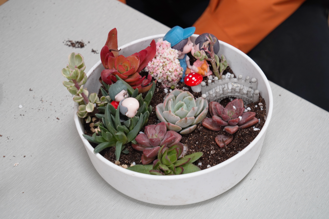 活动当天,主持老师在向同学们展示了数十组各具特色、绿意盎然的多肉盆栽作品的同时,详细地讲解了多肉盆栽的制作方法和搭配技巧。