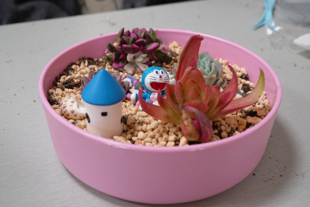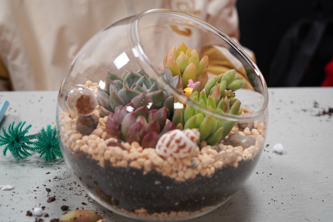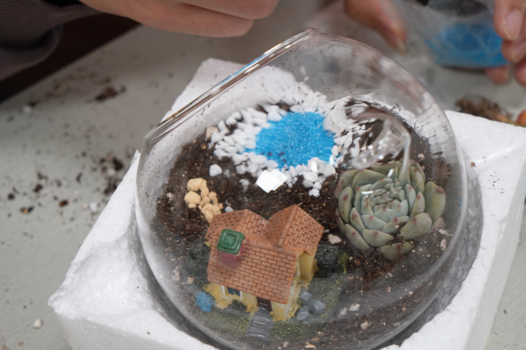 紧接着,同学们在老师的示范和指导下,进行着挖坑、放苗、填土、浇水、修剪等一系列种植过程。在专注种植的过程中,一幅幅微缩景观,一个个妙趣横生的小世界,逐渐呈现了出来。绿意,就这样在菁菁校园中流淌;而同学们也在绿植制作的过程中体验着耕耘于收获的意义,看着这些亲手种下的多肉盆栽,他们不禁感叹:“种植不易,护绿更难。”