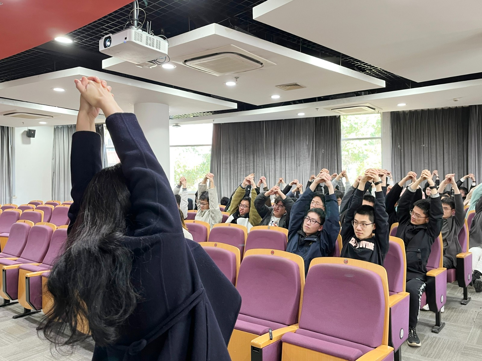 张洪英老师首先带领大家练习了放松动物操,包含金猴缩颈、仙鹤展翅、贪熊探宝、青龙摆尾等。放松结束后,张洪英老师结合 “萨提亚个人冰山隐喻”介绍了人们在不同情境下可能表现出的不同行为和感受,带领同学们认识了“习得性无助”这一心理现象,讲解了压力下的生理塑造和心理塑造,帮助同学们更好地了解自己。