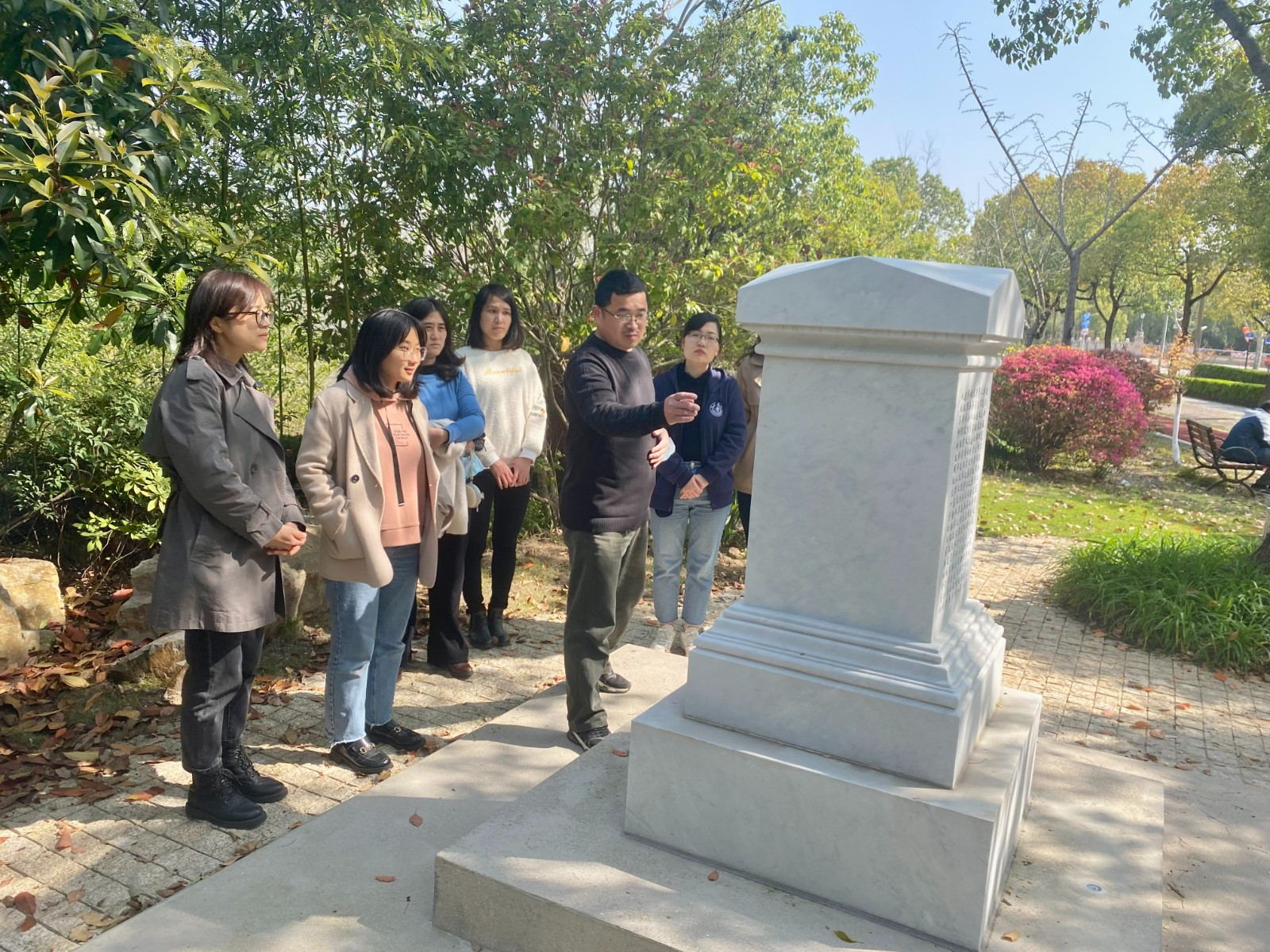 随后,支部一行来到白毓崑烈士纪念碑复建落成处,支部书记刘毓闻向全体党员简要介绍白毓崑烈士生平及纪念碑落成背景。白毓崑1899年进入南洋公学师范院学习,毕业后任教于多所学校,李大钊曾是他的高足,辛亥革命爆发后,白毓崑领导滦州起义,失败后英勇就义。白毓崑烈士纪念碑是交大历史上的重要文物和象征性标志,原碑体仅存四方体束腰及底座,现保存并展示于交大新校史博物馆中。为纪念白毓崑烈士殉难110周年,交大于2022年设计复建白毓崑烈士纪念碑,以铭记那段真实深刻的历史,缅怀先烈英勇献身之志。