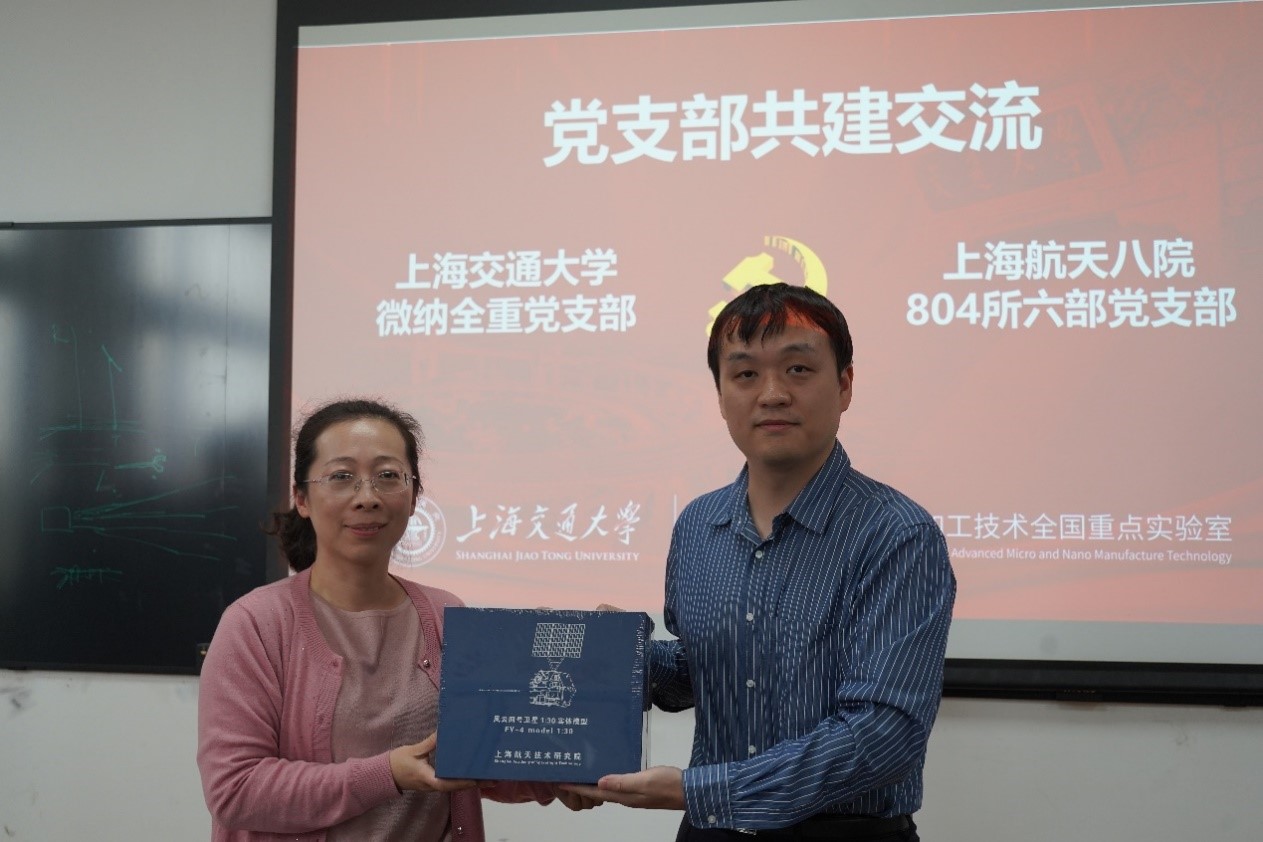 在各位党员同志进行了充分交流后,八O四所六部副部长陈凯和刘景全对本次交流与座谈活动进行了总结,大家一致希望在未来进一步发挥高校和科研院所各自的特长,加大合作力度与深度,实现技术的落地与产品的规模化生产,对接国家重大战略需求和民生经济发展。座谈结束后,八O四所六部党支部向微纳全重党支部赠送了风云四号卫星1:30实体模型,期望双方支部在后续能够开展更加频繁与深入的合作。