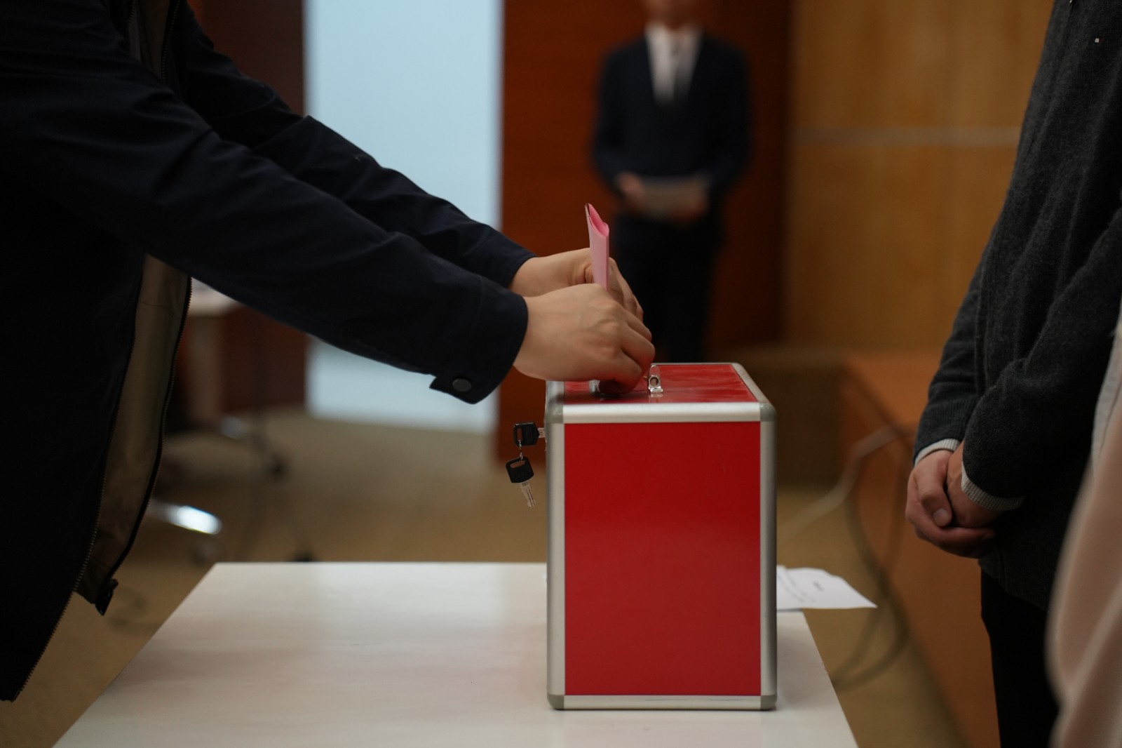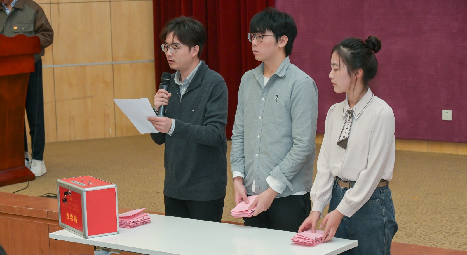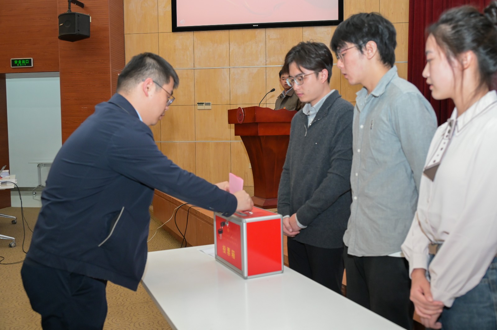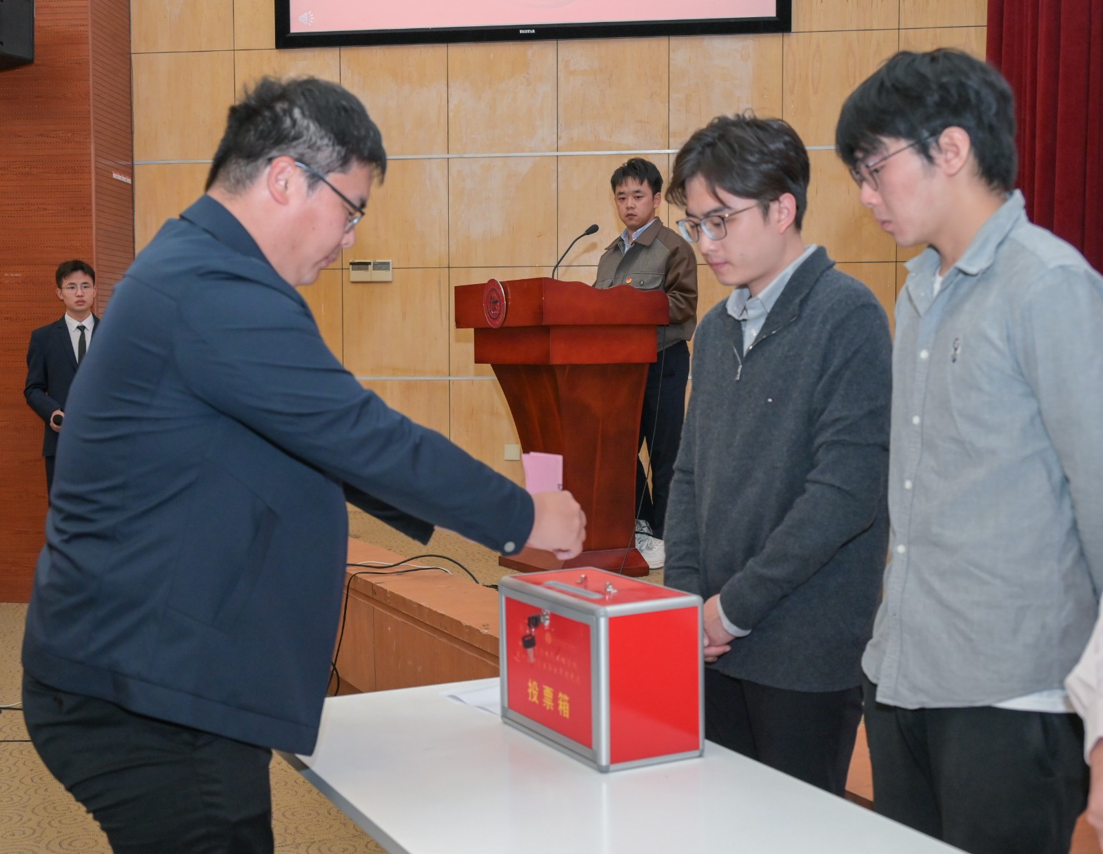 大会选举环节采用无记名差额投票方式,从候选人中选举出40名共青团好色tv 第十四次代表大会电院代表。总监票人、监票人至监票区就位后,展示票箱和选票,工作人员发放选票。各位代表仔细阅读会议文件候选人简介,客观评定,仔细填写,在工作人员指引下依次投入票箱。由监票人清点并宣读选票回收情况,确保选票数量正确无误。