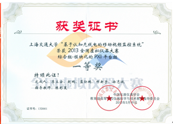 2013年5月18日至5月19日,2013全国虚拟仪器大赛决赛在天津大学举行,电院自动化系智能无线网络与协同控制中心参赛团队I-WIN,凭借作品“基于认知无线电的移动视频监控系统”,获得模块化的PXI平台组第一名的优异成绩。该参赛队伍由自动化系陈彩莲副教授指导,由自动化系博士生李立安担任队长,其他四名队员分别是来自自动化系和电子系的本科生,包括大四学生赵鹏,大三学生蓝劲鹏、祁新宇、徐志诚。