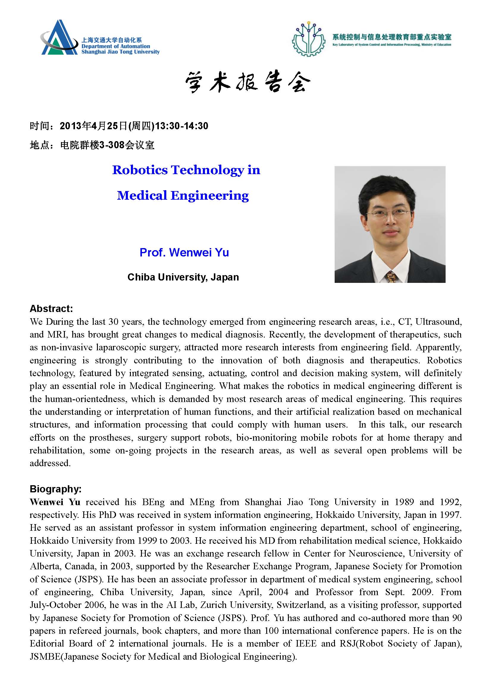 "Robotics Technology in Medical Engineering" by Prof. Wenwei Yu (Chiba University, Japan)